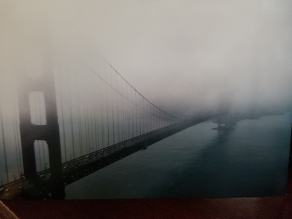 After a fantastic week, it was time to go home. I decided to take a different route home, going through the Sonama Valley and hugging the coast to San Francisco. As we approached the northern end of the Golden Gate, hills to the west shielded us from the Pacific Ocean. The top of these hills were shrouded in a thick, rolling fog. As we continued down the highway, the fog descended down the hills and splashed onto the road bed. It was if someone had taken a pitcher of fog and poured it down the hills. Descending with purpose and velocity, the fog hit the roadbed, rebounding into to air, explosion like. Cautiously driving my rental burgundy Buick LeSabre, through this cascading cloud, we reached Battery Spencer, a park above the Golden Gate roadbed. Pulling in, we wanted to get some pictures from this vantage point.